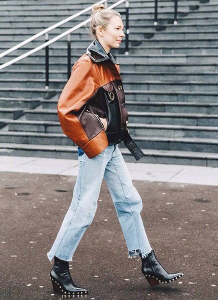 Roberta Benteler,拼色机车夹克+不规则毛边牛仔裤+粗跟踝靴,造型时髦实用,无论多复杂的,牛仔裤和黑色踝靴都能完美消化。