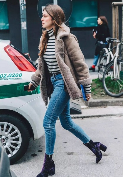 羊羔毛外套+条纹高领毛衣+牛仔九分裤+丝绒短靴,光泽闪耀的丝绒短靴是整身装扮的点睛之笔,给基本组合之外更添一份奢华质感。