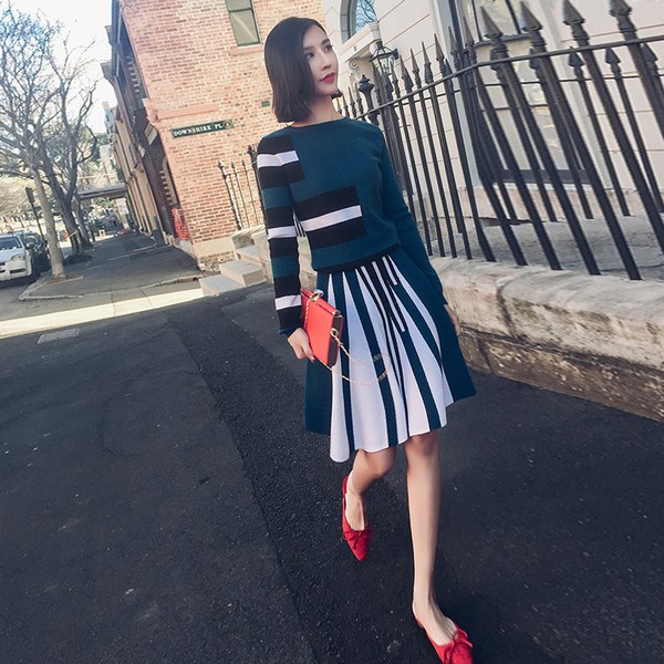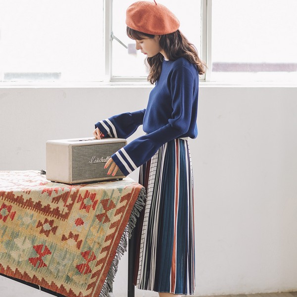 05 针织衫加半身裙的组合,一定能让秋天大放异彩。别说色彩对秋冬不够好,有的存在一切皆有可能。百褶撞色,半身裙的魅力从来不打折扣,针织衫加长了衣袖突然就变成一种惬意。