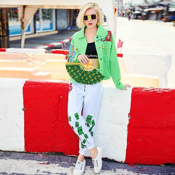 07 荧光绿色比正常的绿色增加了明亮度,虽然对美白的程度有很大的要求,但能带来的个性点缀也是十分自然的。夹克式的工装外套,少了点女孩子应有的灵气,从来是十分常见的帅气姿态。