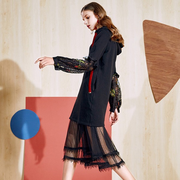 02 同样是网纱拼接,在衣袖处做一点呼应,让蕾丝灯笼袖与网纱裙摆共同营造轻盈飘逸的感觉,即使没有浪漫的女人味也不会少了连衣裙的从容不迫。连帽的随意也许就是在挑战这份灵动吧。