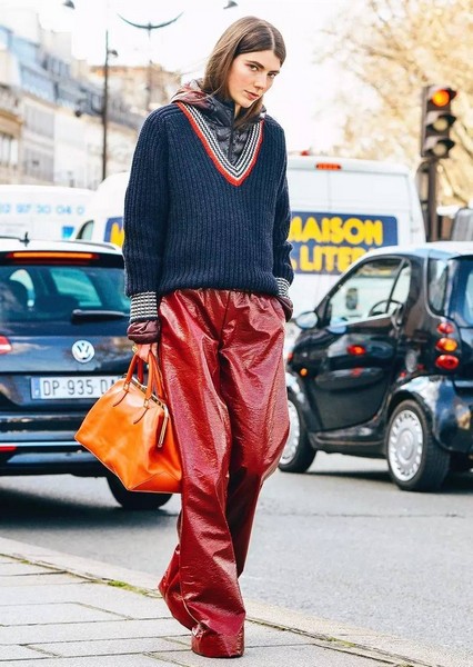 板球毛衣、西装外套、烟管裤都是寻常单品,Victoria G却将它们穿出典型的法式优雅范,亮色毛衣和撞色V领在暗色造型中格外出彩,V领与严肃单品相互衬托造型性感而高级。