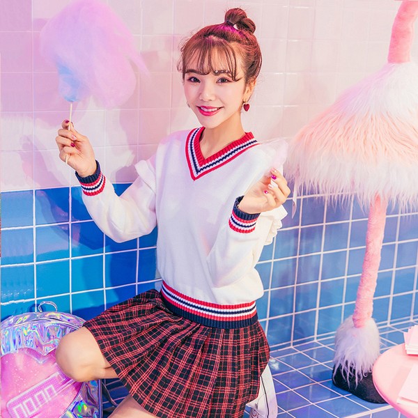 03 同样是短款,版型略修身,除了衣身边缘各处的撞色条纹,在肩部附近还加入了一道小荷叶边,风格更加可爱,比较适合娇小软萌型妹子,穿搭繁简皆宜,配休闲日常,与小短裙就是萝莉本尊上线。