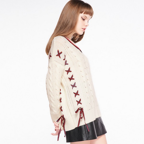 05 除了自带的撞色条纹外,还可以加入更多细节,绞花具有膨胀感立体纹路,因此版型对应的是显瘦宽松款,与衣领条纹同色的绑带点缀在衣身两侧增添活泼趣味,纵向划分也有一定的修身效果,简单搭配清爽亮眼。