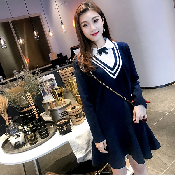 12 荷叶摆毛衣裙+蝴蝶结衬衫的假两件拼接温柔可爱,藏青配白色再加一抹红还是逃不过学院风经典配色,再现白皙水嫩青春芳华,无论休闲正式还是参加party都有着不俗的减龄功力。