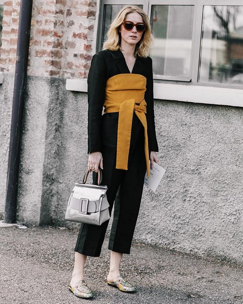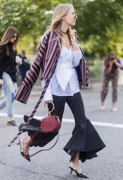 Irina Lakicevic在衬衫外加上结饰抹胸上衣帮助修饰比例,也将司空见惯的条纹衬衫+小黑裤造型穿出不一样的潮流味道,质感鞋包则体现时装精的好品位。