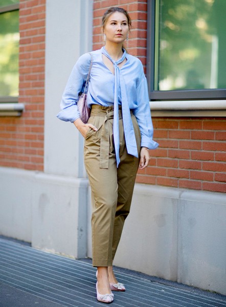 衬衫+各种裤装固然通用,但要不普通还是得看细节表现,浅蓝飘带衬衫+卡其色纸袋裤清爽知性,飘带装点下的锁骨和脚腕到脚背的露肤,都是最具时髦表现力的地方。