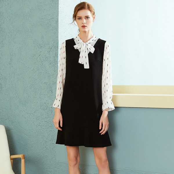 05 最适合偷懒的假两件连衣裙,一件搞定两件的层次感,蝴蝶结领和喇叭袖口设计清新柔美,手绘风印花点缀雪纺衫随性浪漫,拼接鱼尾摆婉约优雅,简约黑色背带裙舒适显瘦,有它在,日常造型快又稳。