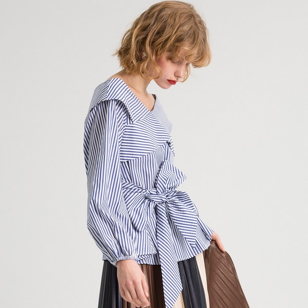 09 充满变化的剪裁改变了条纹的规矩刻板,交叉双层领营造出显瘦的大V形,长绑带可以绑在腰上也可以用作领巾,打破单调增添更多造型趣味,舒适面料修身版型衬托知性风采。