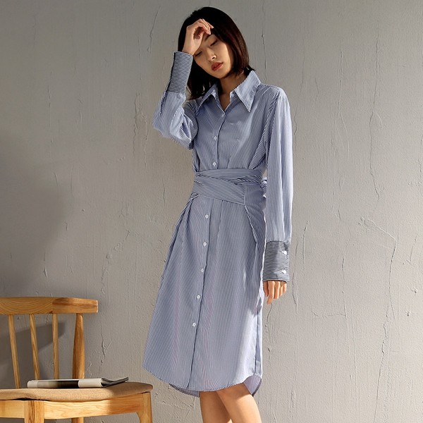 12 基础款衬衫裙也是百搭不出错的经典好物,最好穿的除了白色款就是蓝白细条款,这件也在腰部加了本布长飘带,收出腰线往后捆绑打结,形成前面简洁、后面可爱的效果,显瘦又浪漫为简单款式增添魔力。