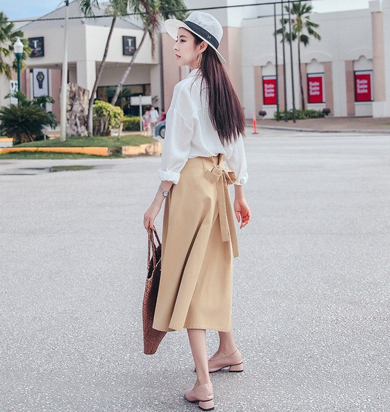 10 高腰A字裙前面显高显瘦、简洁优雅,转身之后才是惊喜,腰后收褶系结甜美飘逸展现全新活力,一举一动都惹目光追随,用来配白色上衣显得清新明媚,配裸色鞋履还能继续延伸比例。