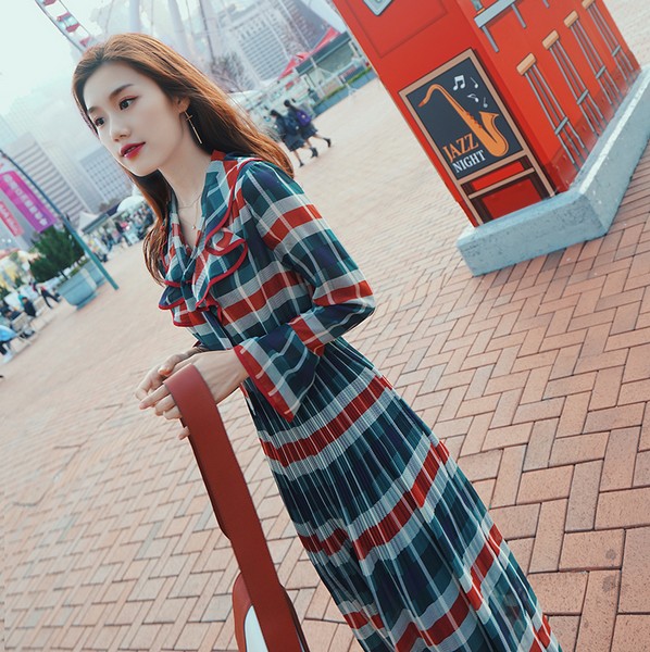 04 有些女人味的霸气是难以用语言去描摹的。喇叭袖,鱼尾裙摆摇曳,原本可以是甜美可以是性感的连衣裙却在色彩的组合中呈现一种独特的霸气,不那么凌厉却让人过目难忘。