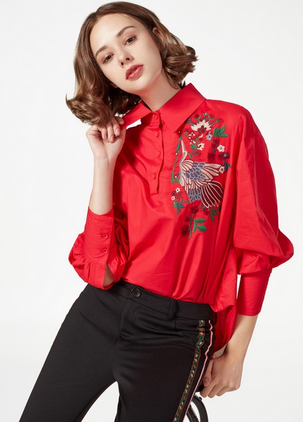 08 套头衬衫适合和小众的单品叠穿,市面上的衬衫,大都是开衫,从这个层面上来讲,套头衬衫就不属于常规的范畴了,再加上艳丽的红色,以及精致的图案点缀,搭大众的单品未免有些浪费,不信,试试就知道了。
