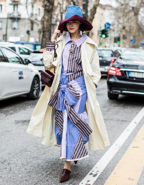 MFW FW 2018,复杂的花色与设计让这件条纹衬衫裙很是炫目吸睛,充满艺术感的单品与考究的搭配轻松化为镜头的宠儿。