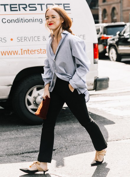 纵向排列的中等条纹中性气质较浓,Anya Ziourova用绿白条纹衫做中性风外套的内搭清新亮眼。