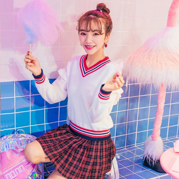 02 同理,主打学院风的撞色针织衫也是一样,俏皮可爱的感觉由内而外散发出来,挡都挡不住,个中渗透着的减龄效果,简直不要太显著,风格比较清新的妹子一定不能错过,能不能撩到校草就在此一举了。