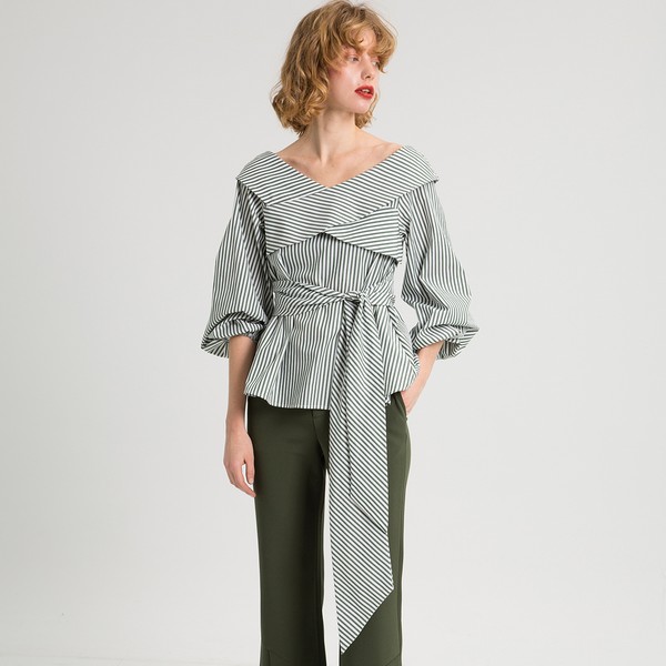 05 既然条纹并不难得到,那么想要让条纹与众不同就要在款式上多加用心。除了木耳边的甜美,还有一种设计感叫不规则。系带设计呈现的收腰效果让人意想不到,搭配实在妙极了。
