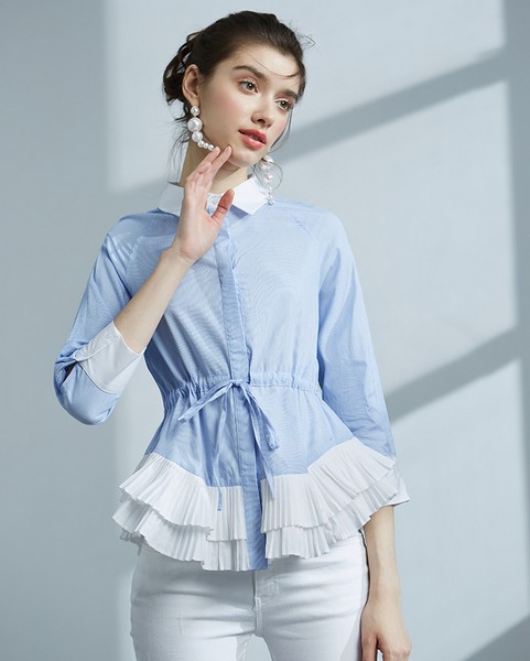 06 抽绳收腰的明确感要大于系带收腰,但系带收腰在色彩纯粹时最为巧妙。撞色,蓝白撞色,十分清爽自然的撞色,给人如沐春风般舒爽。百褶荷叶边的重叠结合系带收腰,让小蛮腰的性感呼之欲出。