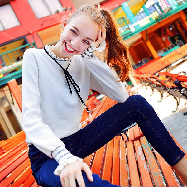 06 纯白的针织不会毫无特色,这不是针织的风格,无论多么简单,针织都有办法让自己在简单中寻找出彩的地方。卷边圆领的俏皮,有小巧的知性,波浪花边的释放为搭配A字伞裙增加底气。