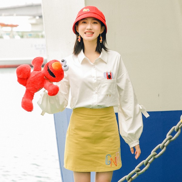 03 这件除了复古甜美的灯笼衣袖加蝴蝶结组合呼应了潮流之外,左胸口袋处半遮半露的彩色图案体现了活泼有趣的个性,青春学院气质也浓缩在这些关键细节中,因此它和轻松自在的牛仔、帆布单品配一脸。
