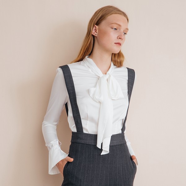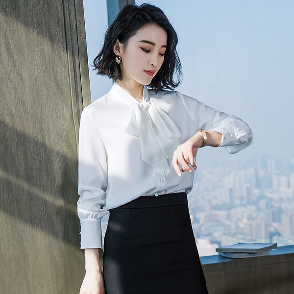 09 蝴蝶结这样柔软的元素用于职场装扮中,起到刚柔并济的调和作用,显优雅甜美气质,袖口三粒扣收出微灯笼袖与细褶清爽又帅气,雪纺面料爽滑垂坠易打理,高效百搭为忙碌通勤节省时间。