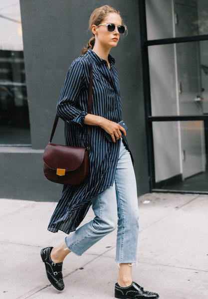 NYFW SS18,比上套造型更加简化,衬衫裙搭配牛仔裤与懒人鞋实穿性强,轻松hold住比例与流行,无需太多费脑,记住开扣越高腿就越长、裙摆也越飘逸潇洒的时髦法则。