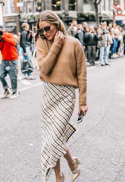 ,基本款毛衣配一条特殊剪裁或图案的裙子,或穿一双耀眼的鞋履就能让造型出挑,Olivia Palermo这身色彩协调得很好,显得优雅高级。