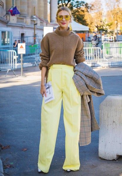 Roberta Benteler,驼色半高领毛衣+阔腿裤,宽松的半高领不挑脖长,搭配纵向流线耳环不仅增强个性还能心机显脸小,衣摆塞入、裤管藏高跟无敌显腿长,展现气场大女人范。