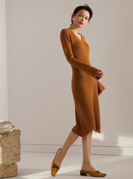 09 针织裙融入流行元素加上特色剪裁表达时髦个性,喇叭长袖、至膝长度端庄大方,不规则裙摆通过摆模糊边界显腿长,天然面料,纵向坑条与垂坠感都能有效避免横向发展,加上外套助攻时显高瘦效果尤甚。